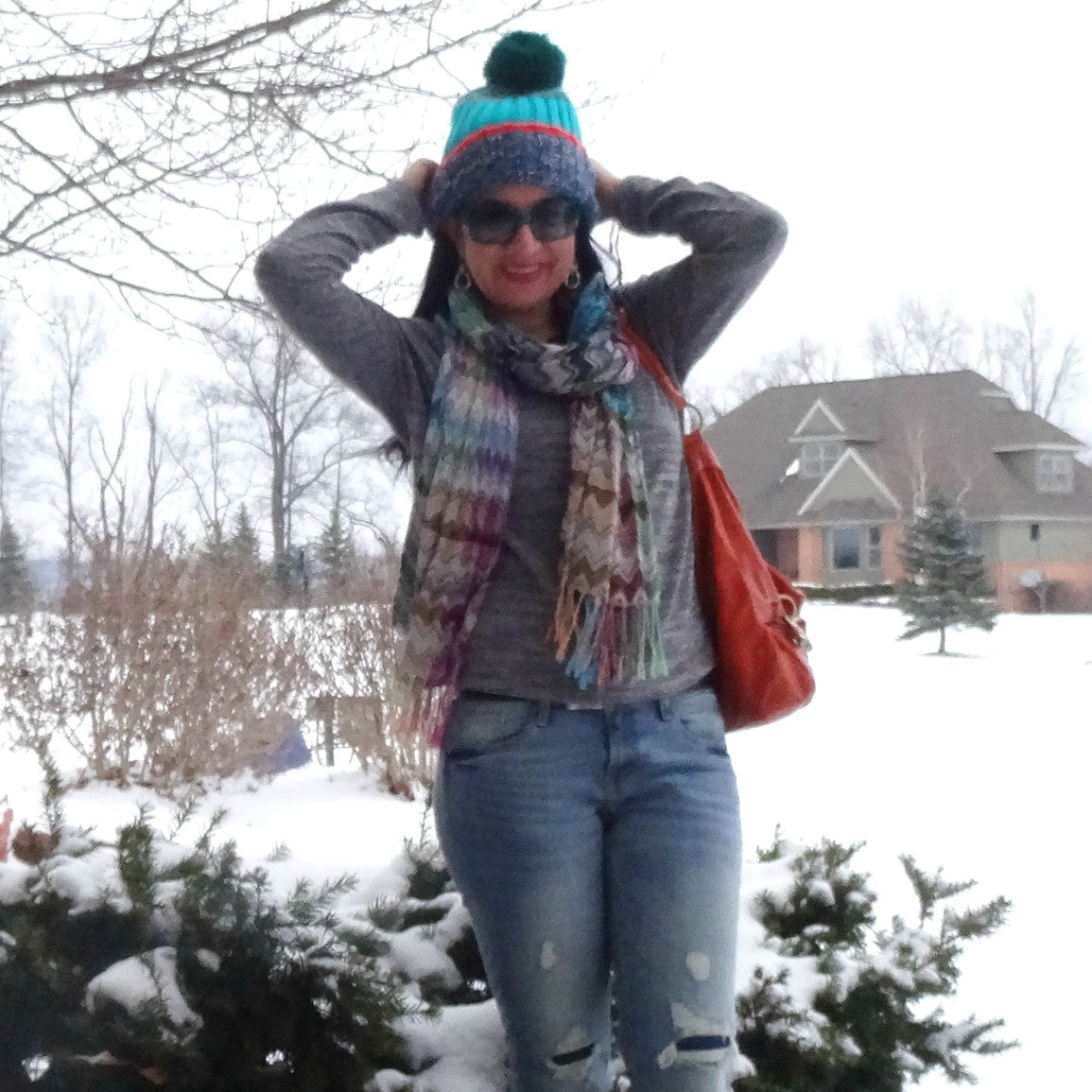 2. It's been hard to dress lately with the weather being warm one day and snowing the next! Love your colorful hat and scarf! You look so cozy and chic!